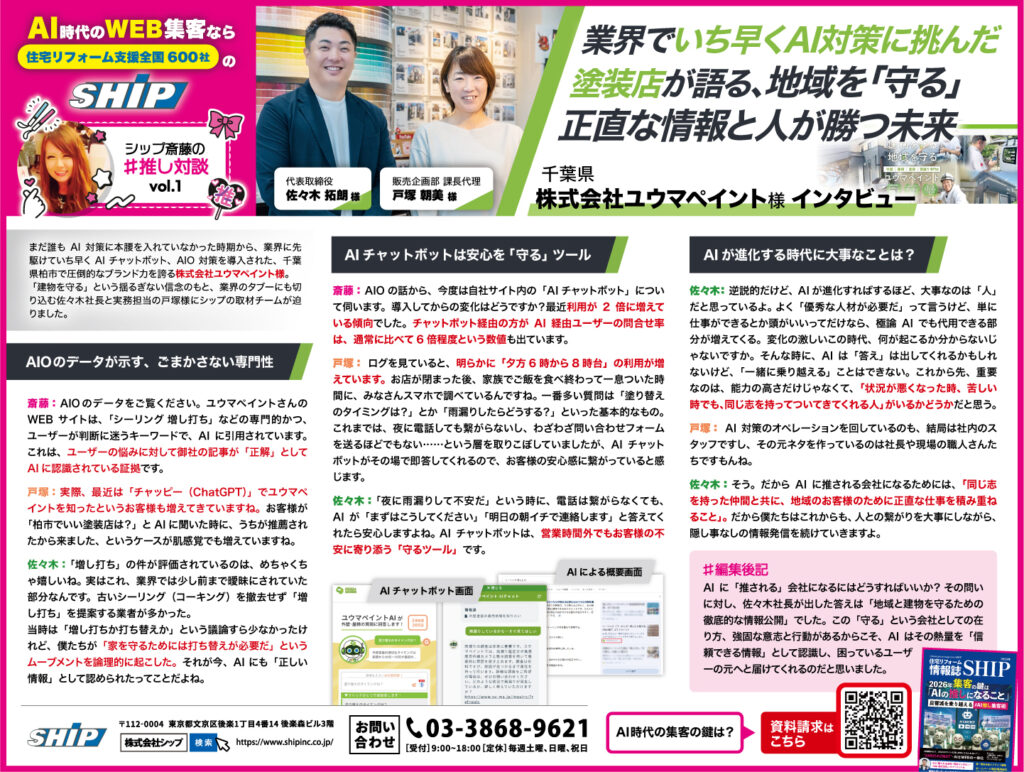 斎藤 その底知れないバイタリティが、新しい取り組みへの原動力なんですね。実は今日のテーマである「AIの導入」「AIO対策」についても、ユウマペイントさんはシップのお客様の中でもいち早く導入されていました。なぜそこまで早く決断できたのでしょうか?